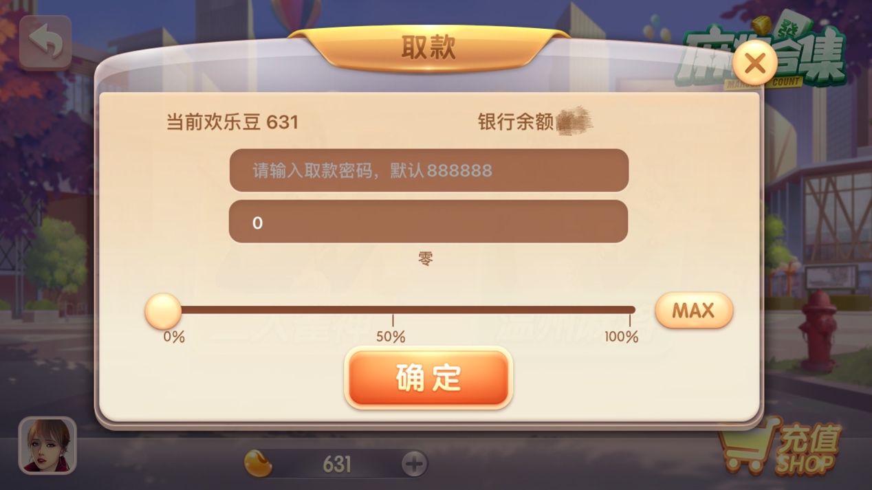 玩家可以点击欢乐豆旁的“+“按钮,进入银行取款界面,输入要取的金融,点击”确定“按钮,即可完成取款。